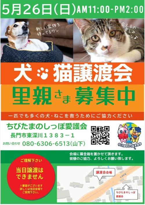 5月26日(日)11時から14時まで、長門市ちびたま斜め前、一斉不妊手術会場で譲渡会を開催いたします。