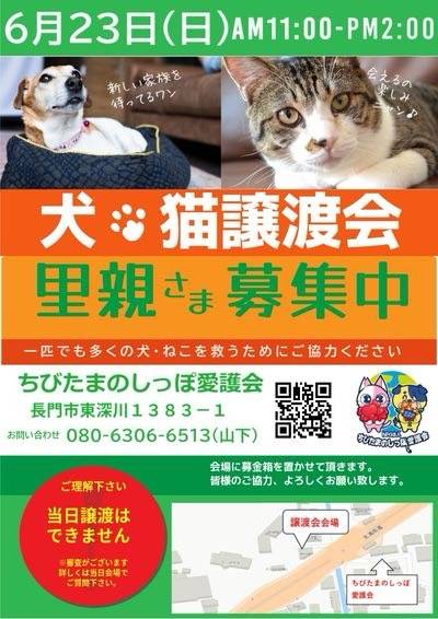 6月23日(日)11時から14時まで、長門市ちびたま斜め前、一斉不妊手術会場で譲渡会を開催いたします。
